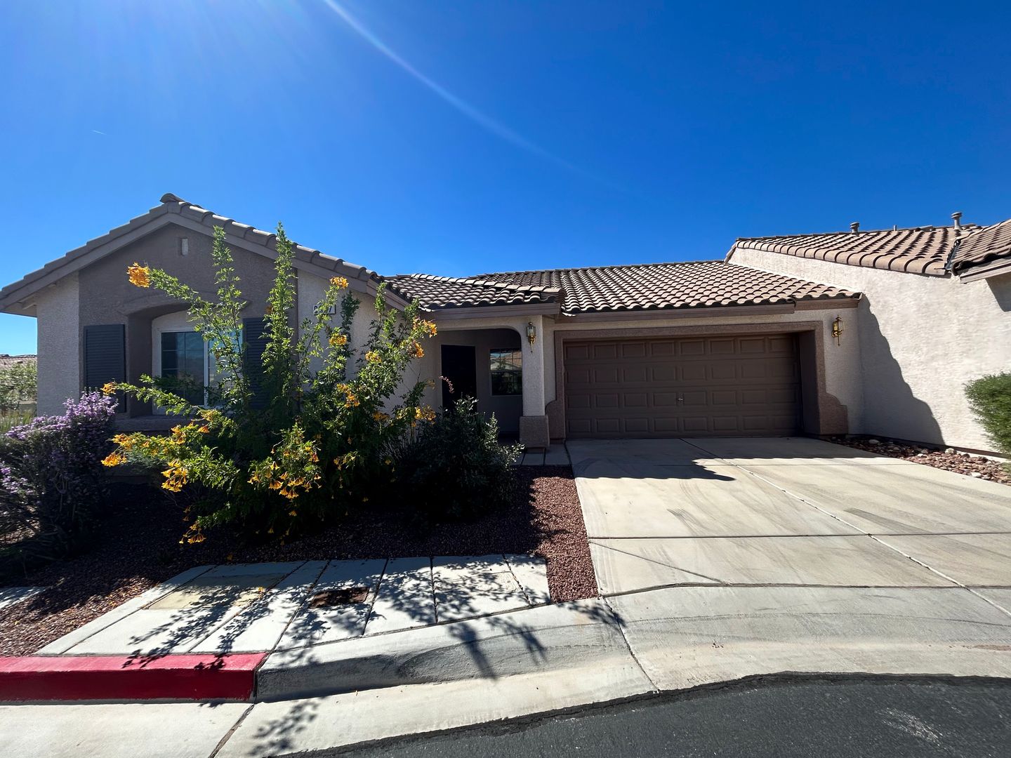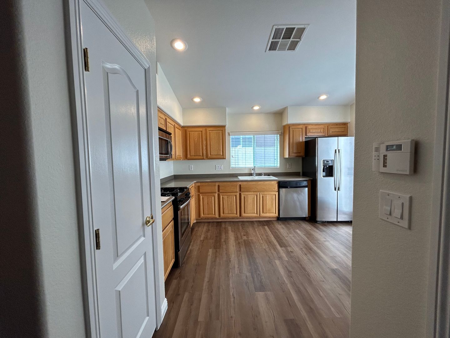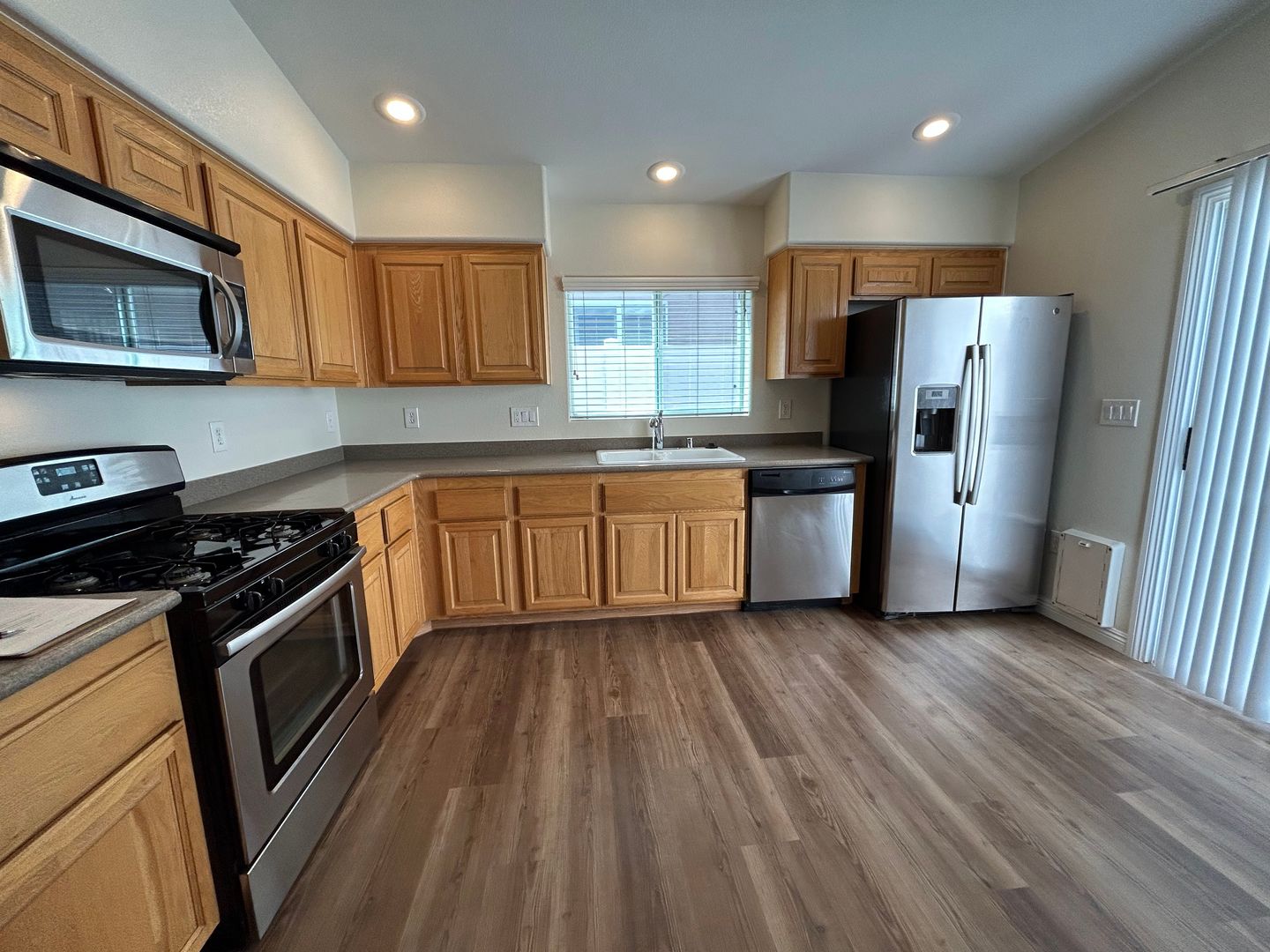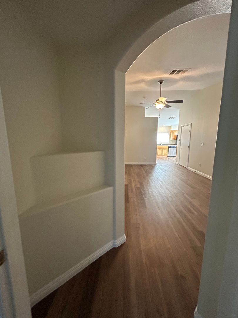 Welcome to this beautifully maintained 3-bedroom, 1.75-bath single-story townhome with a 2-car garage. This home features luxury vinyl plank flooring throughout and ceiling fans in every room for added comfort. The spacious kitchen offers solid surface countertops, stainless steel appliances, and plenty of room for cooking and gathering. The primary bedroom is separate from the secondary bedrooms, providing added privacy. Enjoy a low-maintenance back patio, perfect for relaxing. Don’t miss out