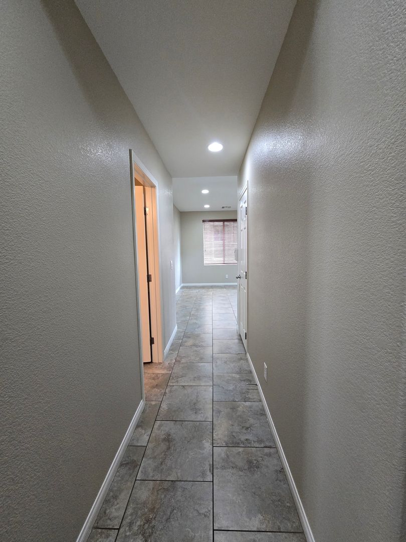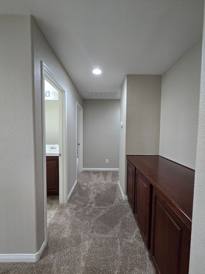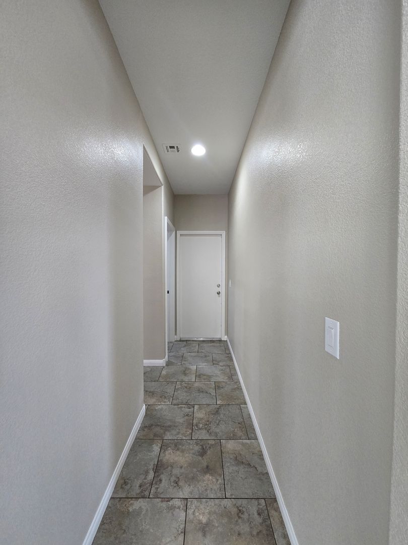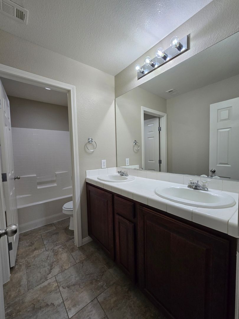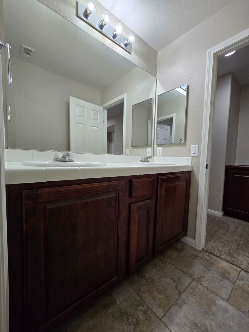 Spacious 5-bedroom, 2.5-bath home with a 3-car tandem garage. Step inside to find formal living and dining rooms with tile flooring, leading to a bright family room and open kitchen with an island breakfast bar, granite countertops, all appliances included, and a walk-in pantry. The kitchen and dining areas also feature tile flooring for easy maintenance. Upstairs, the primary suite offers a ceiling fan, a walk-in closet, dual sinks, a makeup vanity, and a separate tub and shower. Four additional bedrooms provide plenty of space for family or guests. The backyard includes a patio and ample room for entertaining or relaxing. Low-maintenance landscaping. This is a wonderful home with room to live, work, and play.