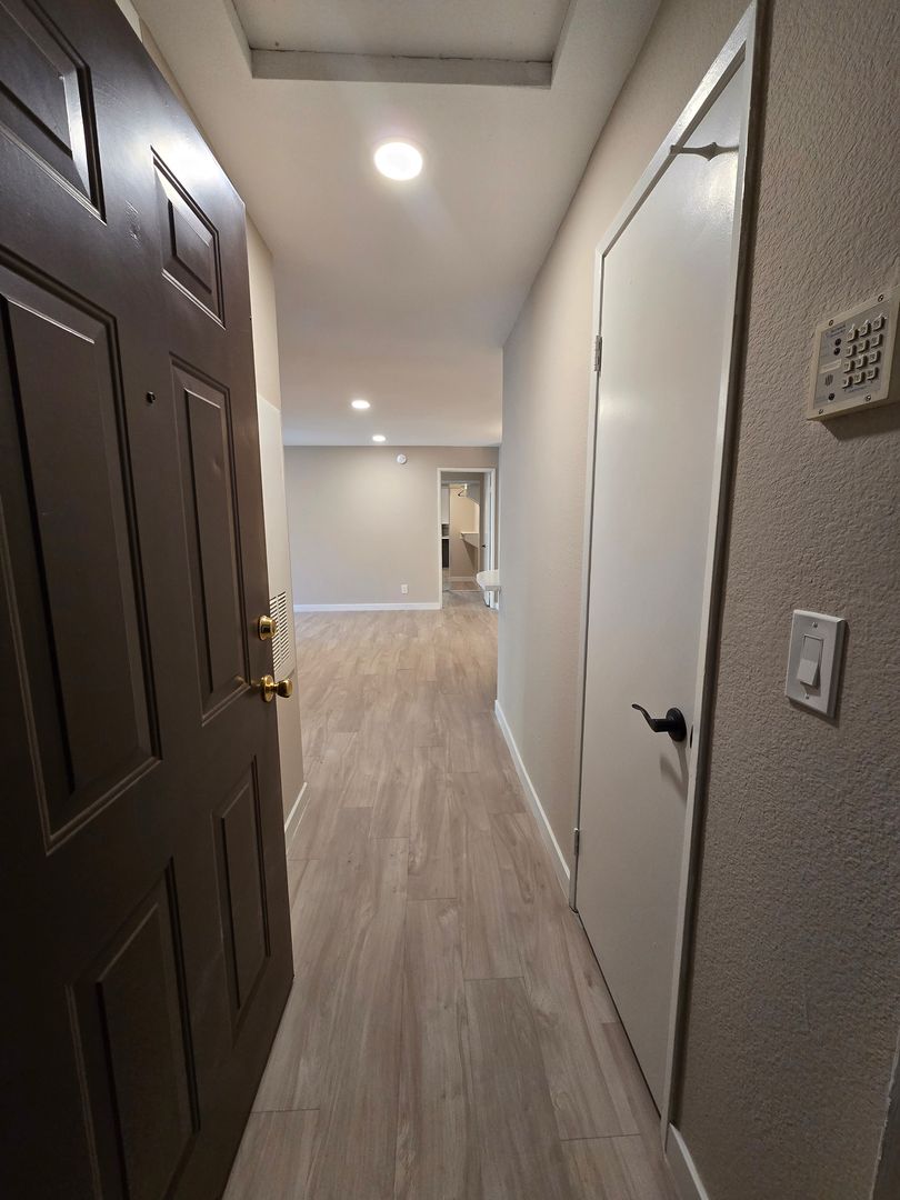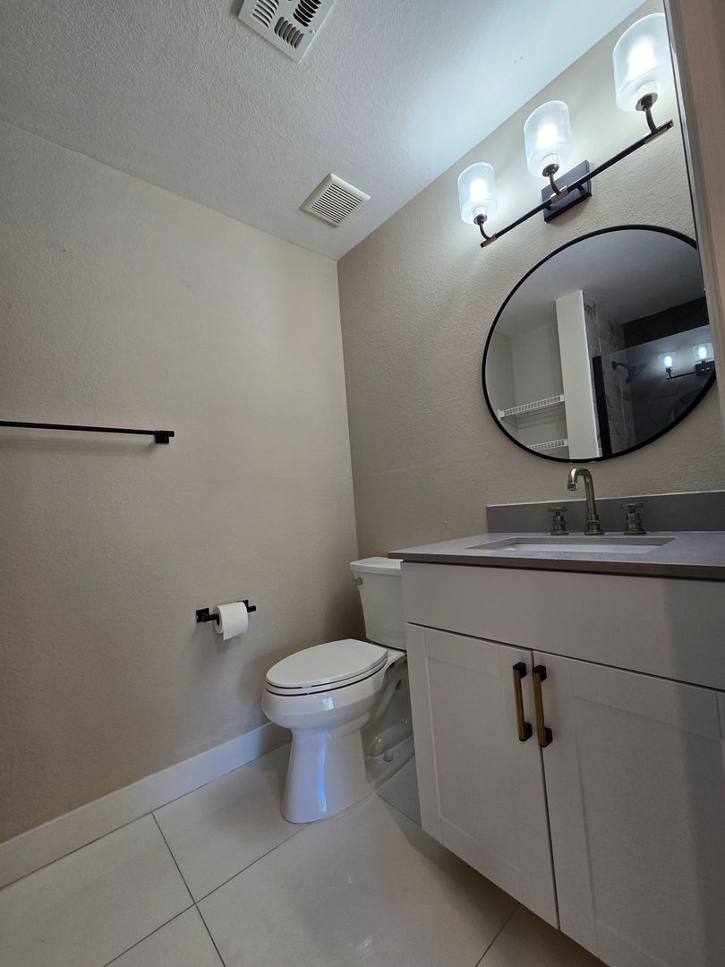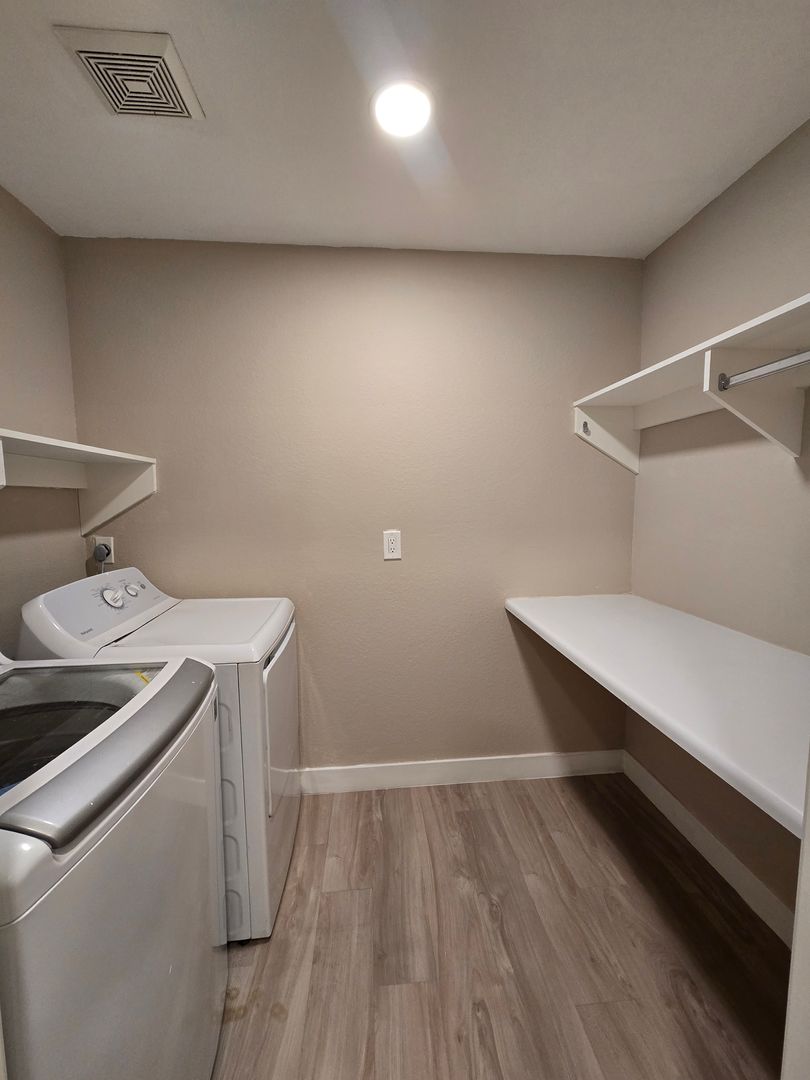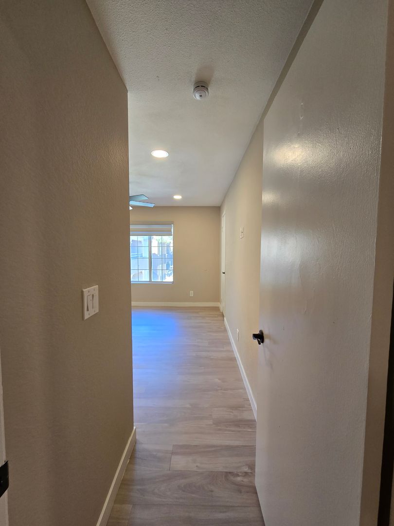 Step into this beautifully upgraded upstairs unit with an open floor plan designed for both comfort and style. The home features laminate wood-like flooring throughout, with tile in both bathrooms. Freshly painted and move-in ready, this unit offers a large living room with a cozy fireplace and a striking designer tile wall that opens onto a private balcony—perfect for enjoying a peaceful evening breeze. There are two spacious primary bedrooms, each with its own bathroom. Both bathrooms include walk-in showers and tastefully designed vanities, giving each room a sense of privacy and sophistication. The kitchen has been highly upgraded with stainless steel appliances, a modern backsplash, and plenty of cabinet space for storage and convenience. A washer and dryer are located inside the unit for added ease. With its stylish finishes, open layout, and thoughtful upgrades throughout, A MUST-SEE!!!